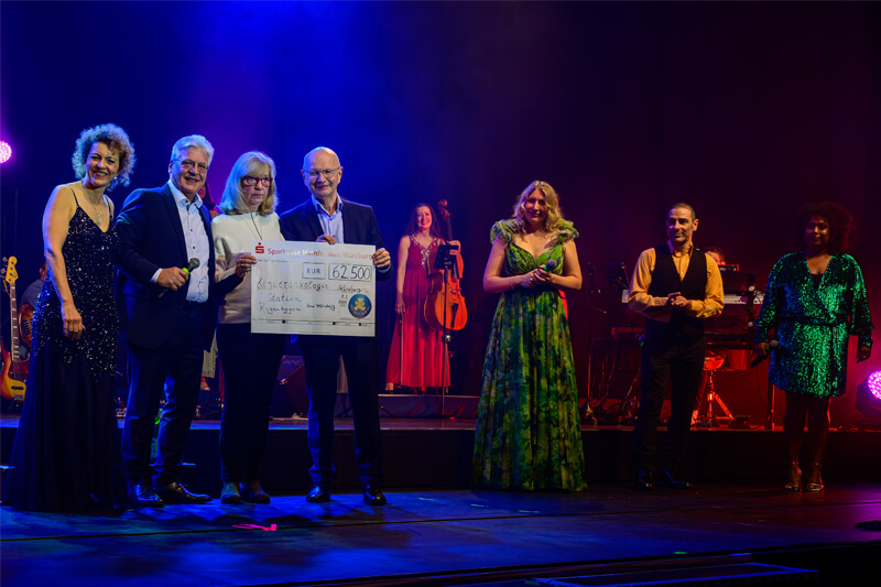 Dank der zahlreichen Sponsoren konnten mehr als die gesamten Eintrittsgelder übergeben werden. Es war mit 62.500 Euro die bisher größte Summe, die mit diesem Konzertformat erlöst wurde. Während die Elterninitiative Regenbogen die betroffenen Kinder und Familien im klinische Umfeld unterstützt, werden an der Kinderklinik neue Therapien zur Heilung der jungen Patienten vorangebracht. Schirmfrau des Abends war Bürgermeisterin Judith Roth-Jörg, die die Leistungen des Vereins“Hilfe durch Spaß“, der Elterninitiative und die herausragenden Forschungsleistungen der Kinderonkologie würdigte.